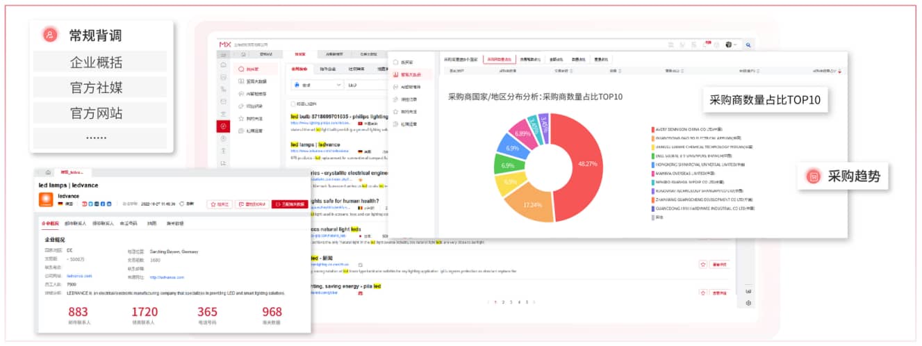 在此过程中,企业可以轻松获取目标客户的多维信息,例如企业概括、官网信息、社媒信息、关键决策人联系方式、采购周期、供应链上下游数据等。