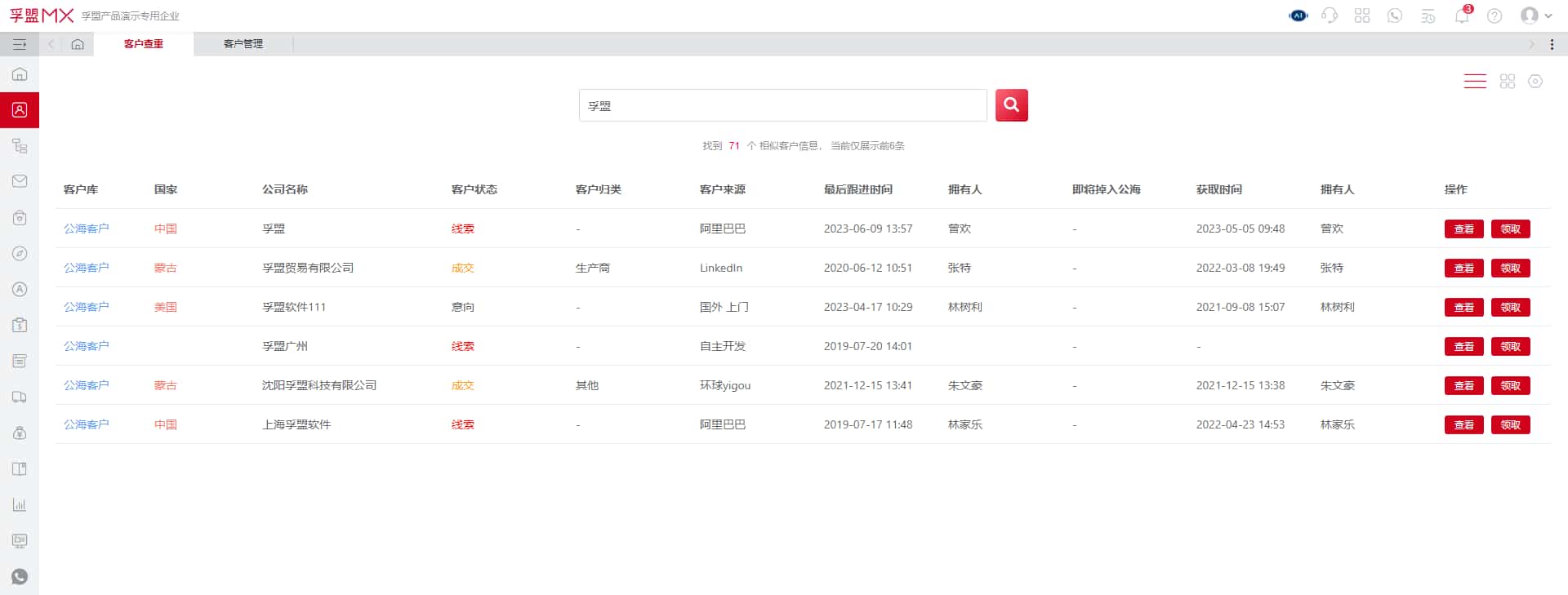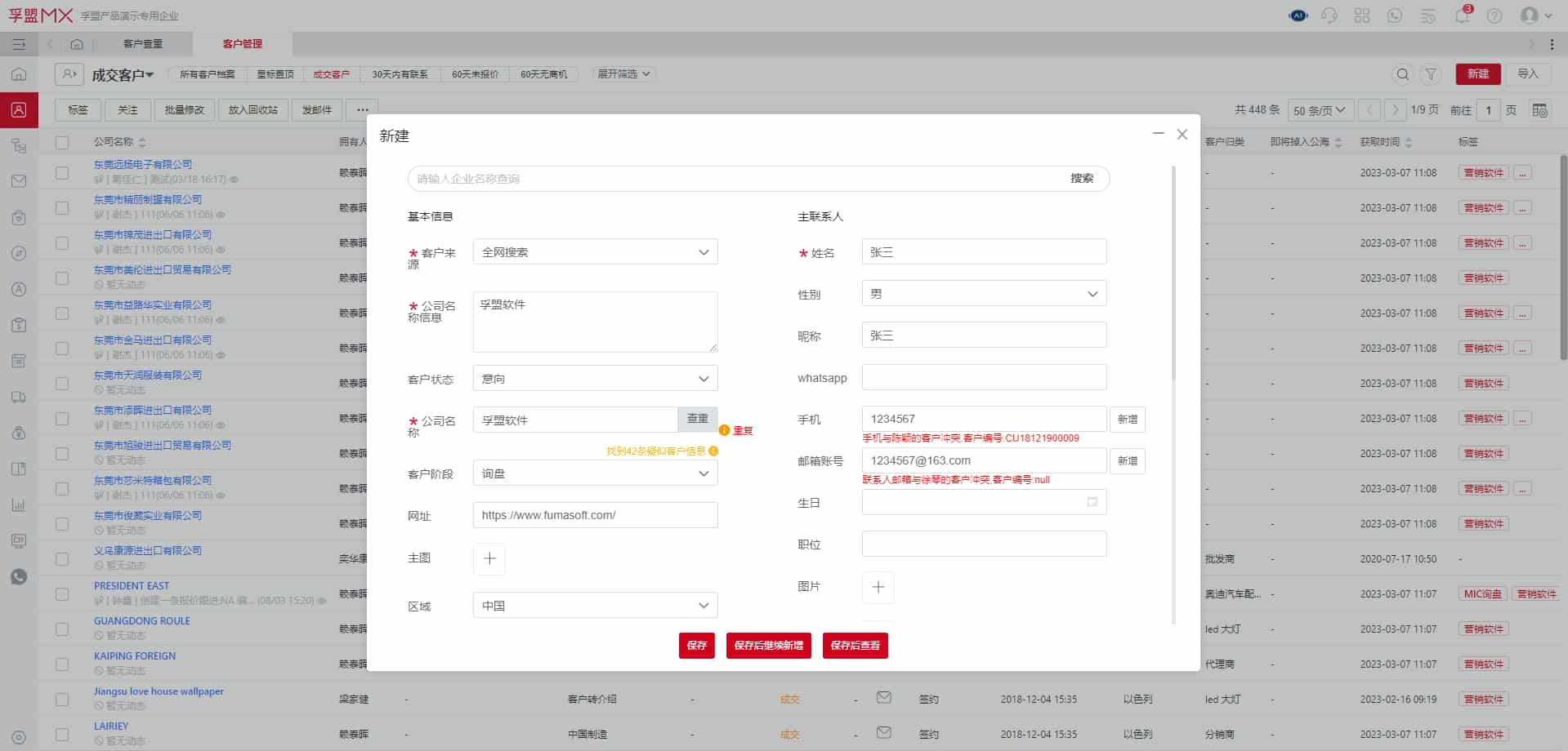定制后的孚盟系统支持以主动及被动的形式对录入资料进行查重。在业务员正在录入客户资料时,系统将会对该客户自动发起多字段查重检查,若检测到该客户已存在于系统内则不予录入。