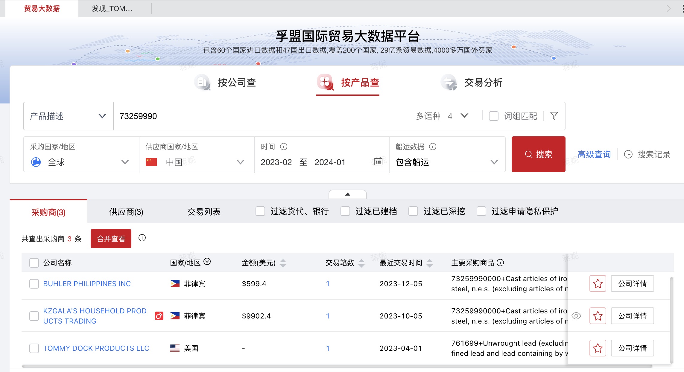 对于出口的国家,我国有色金属铸件主要出口到美国、韩国、澳大利亚、日本等国家和地区。这些国家对有色金属铸件的需求量较大,所以在客户开发方面只要着重对着几个国家级区域进行针对性的开发即可,这里推荐使用孚盟外贸客户开发软件,例如以hs73259990为例。查询如下: