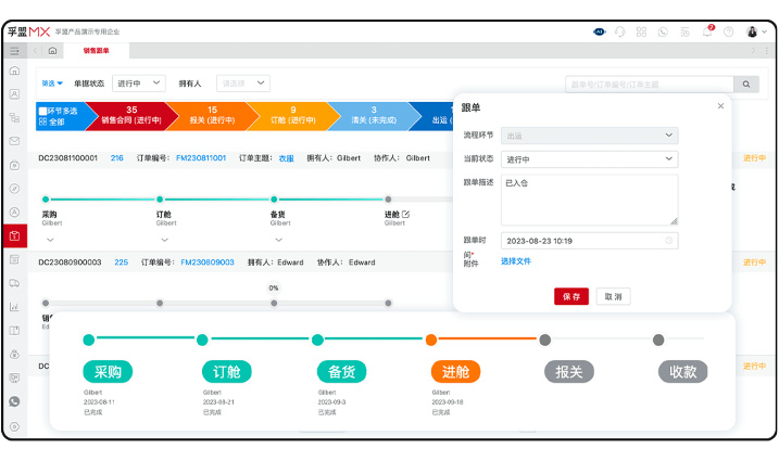 2、销售与市场管理:外贸业务部负责市场调研和营销策划,制定相应的销售计划并组织实施。外贸公司可以通过多种方式来扩大市场份额,如参加国际展会、建立网上销售渠道等。通过软件来进行改业务流程节点的跟进可确保业务的可见性及正向发展。