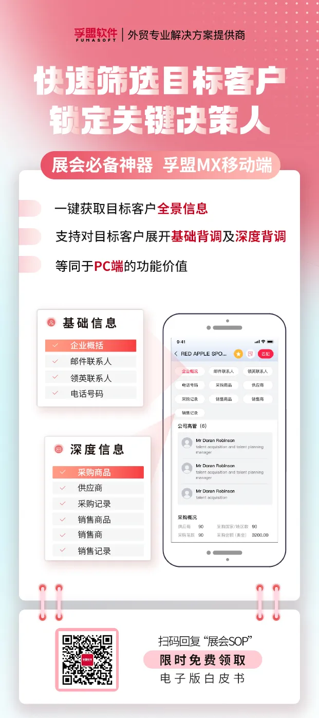 外贸人的国际机遇来了!一起来看看如何抓住?分享外贸参展获客3大关键攻略,助你有效参展,快来看看吧! 【如果我们的内容对你有所帮助,别忘了关注我们!后续还会有更多关于外贸管理和外贸营销的干货文章。】 一、摸好底 广交会上会出现许多新客户,要始终记得交换名片,附上宣传小册子。如果可以的话,我们可以借机观察下客户的身份证件,例如护照、身份证等,判断客户的身份和国籍是否真实,从而减少遇到“假买家”的概率。 在客户逛展时,我们可以留意客户的行为。如果客户表现得非常积极主动,主动询问产品信息、与驻展销售进行深入的交流,那说明他的成交意向非常高。如果客户表现得比较消极被动,不愿意交流或者对产品缺乏兴趣,这些客户可能是“走马观花”式逛展,并不会在你的展位前停留太多时间。 客户来到我们的展位时,也不能顾着闲聊,一定要占据主导地位,迅速捕捉客户的潜力。可以从以下四个方面进行客户摸底,在心中描摹客户画像。 Main Product:客户主营或感兴趣的主要产品 Market:客户的市场,并介绍公司在该市场的案例 Channel:客户的销售渠道是线上、实体还是其他 Price/Quantity:客户的预期价格与订货数量 二、聊好天 在与客户进行沟通时,我们可以留意客户的询问内容。真正有成交意向的客户会关心很多合作细节,他们的询问内容非常具体,例如询问产品的规格、价格、交货期限等。相反,如果客户的询问比较笼统、泛泛而谈,很可能是低质量客户或无效客户。 主动出击,有时也能取得意想不到的效果。我们可以主动询问客户的需求,能够详细地描述自己的需求,并且有一定采购倾向的客户,大概率是高质量客户。如果客户自己都无法清晰地描述,含糊其辞,可见他并没有真实采购需要,也就不必在他身上浪费时间了。 下面是客户通常关注的需求点,可以参考进行问询模拟。 价格 可以进一步了解客户需求数量再报价,并了解客户的具体需求,比如是否贴标、有无特殊要求。数量太大的可以撤展后具体核算再报价。 认证 出示一定的专业认证能够赢得客户的欣赏,提高进一步沟通的可能。可以将证书框裱或用手机展示给客户。 交货期 一般来说客户在交货期的让渡余地较小,错过交货期后果很严重。在公司能力范围内的可以承诺,没把握的可以保守点。 付款方式 不同付款方式对展商和客户都有不同风险,可以用专业的态度给客户分析利弊,争取共赢。现场搞不定的可以回来再谈。 如果面前的客户聊的不错,可以添加WhatsApp或Facebook联系方式,用社交的方式开展生意,谈谈心,约约饭局。 三、用好工具 外贸企业参展效果好不好,展中收集客户线索也是至关重要的。毕竟展会现场来访人员繁杂,客户接待忙不过来,不留神就可能错过优质客户。我们建议外贸企业在展中,打破以往传统,利用线上数智化工具,将客户线索收集和筛选效率提升到极致,提供客户更多触点,留存率至少提高到70%。具体怎么做呢? 扫描名片,一键建档 孚盟MX移动端支持以拍照或相册识别的方式一键录入客户信息,轻松一扫,仅需2秒就可将名片中的内容智能同步至孚盟系统中,大大减少了驻展销售手动输入客户资料来进行背调的时间成本,使大家有更充沛的精力去接待前来垂询的客户。 快速背调,掌握客户实力 借助孚盟MX的【贸易大数据】功能,方便及时对客户进行背调,筛选优质客户,获取优质线索,通过深挖客户的采购信息,进出口交易记录,供应商流失变化情况,判断客户近期是否有真实才买需求。另外,孚盟MX的发现功能,深挖客户的多渠道的联系方式,包括企业公开的职位、邮箱、电话、WhatsApp、以及其他的社媒账号,快速锁定关键决策人。 快速跟进客户,决胜千里之外 通过在线营销物料,对客户进行线上营销,引导客户留资,快速掌握客户兴趣。同时将客户吸引到独立站,传递品牌价值,加深客户印象,同时收集客户访问行为。总之,利用数字化工具将客户沉淀到企业CRM-孚盟MX中,沉淀企业客户资产,并通过社媒、邮件营销、WhatsApp营销等多渠道持续触达客户,最终将意向客户转化为成功客户。 小 结 如何在展会现场快速识别优质客户,抢占先机?用外贸参展必备神器「孚盟MX」移动端,您将能够捕捉到每一个商机,不错失任何一笔潜在的交易!