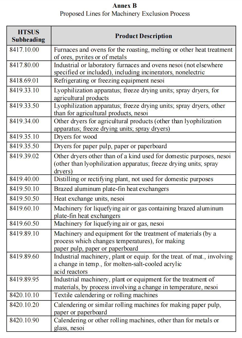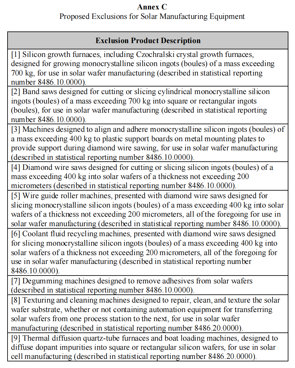 USTR美国贸易代表办公室开始就关税的实施进行公众意见征询,截止日期为6月28日。 目前官网已公布关税清单,分为附件A、B、C。附件A:301关税的拟议修改;附件B:拟议的机械排除程序适用的产品线;附件C:拟议的太阳能制造设备排除情况。