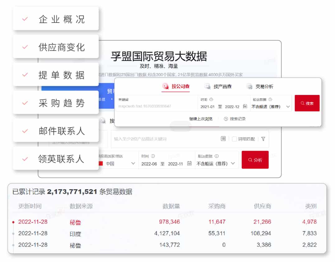 业务经理建议,可以将孚盟旗下集57国出口数据与44国进口数据与一体的【贸易大数据】功能模块作为企业的核心开发渠道。【贸易大数据】最快能在24h内更新海关数据,且能保质保量持续、高效地产出客户线索,是孚盟获客体系中极具“战斗力”的一员大将,以此作为客源探寻主渠道将是天能股份的不二选择。