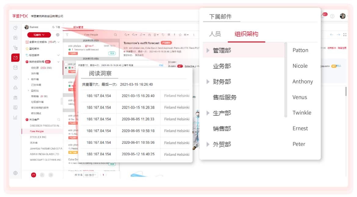 当然,在启用【孚盟邮】后就不必担心此类问题的发生,孚盟系统会对不同身份的使用者设立操作权限,管理者有权利一键切换下属邮件,可以随时监督员工的邮件回复效率、查看员工的邮件内容。在强监管机制之下,业务员们的拖沓行为将得到有效纠正。