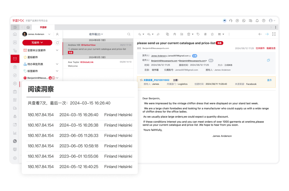 此外,邮件追踪与二次营销的智能化升级,则成为转化环节的“点睛之笔”。孚盟系统的邮件管理模块能实时反馈客户行为数据:不仅能显示邮件打开时间、次数、IP 地址,还能追踪附件查看、链接点击等细节。当某客户连续3次打开邮件时,美拓的业务员可立即通过WhatsApp发送个性化跟进消息,结合客户浏览的产品页面推荐适配方案。这种“数据驱动”的跟进模式,让美拓的邮件打开率实现跃升,二次营销转化率也有很大提升,相当于每发送100封邮件,比之前多获得5倍有效反馈。