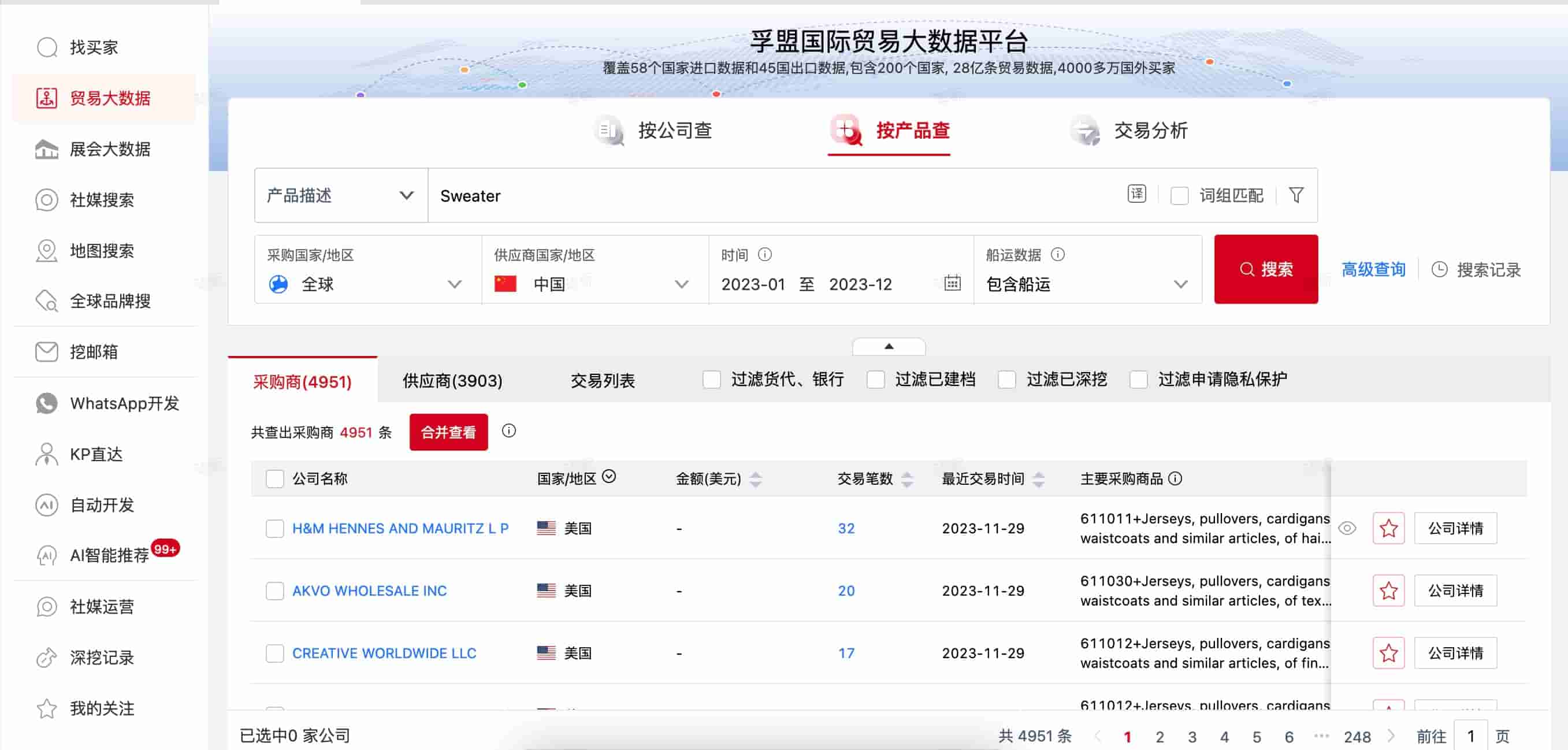 想从数量、金额等方面了解毛衣的出口情况,开发毛衣国外客户?海关贸易数据库是以各国产品真实的报关记录为基础,从各国海关进行统计而得出的真实、有效的数据信息,帮助国内毛衣出口企业寻找最真实的毛衣国外买家,下面我们就以毛衣产品的英文名Sweater为例,来研究毛衣进出口海关数据分析。这里以孚盟贸易大数据为例。外贸客户开发相关:(国外客户开发如何做?)