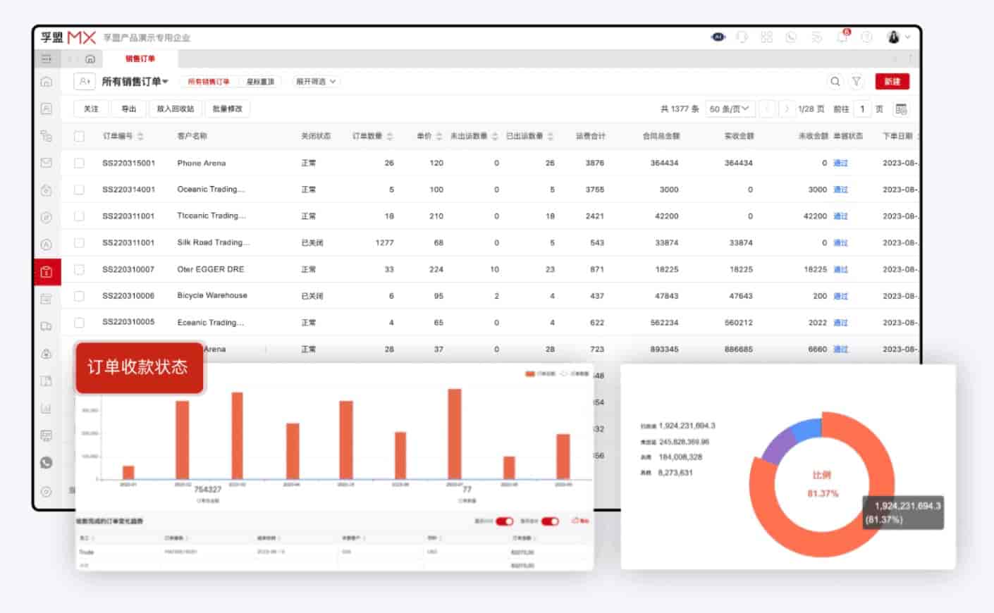 有,孚盟外贸软件就有订单管理及报价功能。并且还包含客户管理及开发,发票管理,出货管理等,另外拥有账号多权限设置功能,满足外贸企业老板对下属的权限分配及管理需求。这里以孚盟外贸软件为例,功能详细如下: