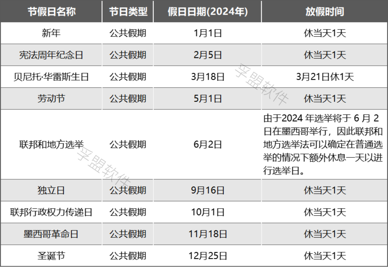 01 墨西哥国家概况 【国 名】 墨西哥合众国 【面 积】 196.44万平方公里 【人 口】 1.29亿(2023年) 【语 言】 西班牙语为主要使用语言 【宗 教】 88%的居民信奉天主教,5.2%信奉基督教新教 【货 币】 墨西哥比索,1美元≈16.7比索 【首 都】 墨西哥城 【对外贸易】 墨主要进口食品、医药制品、通讯器材等,主要进口来源国为美国、中国、德国、日本、韩国等。 【主要港口】墨西哥城港、曼萨尼略港、瓜达拉哈拉港、韦拉克鲁斯港、恩塞纳达港等。 02 墨西哥重要节日