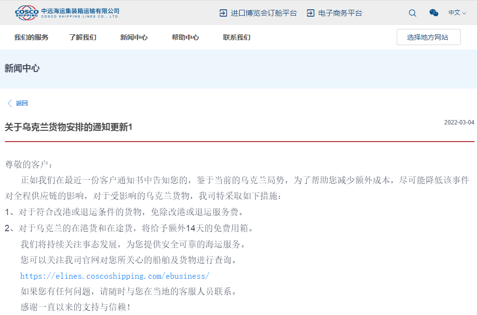 中远海运集运发布公告称,鉴于当前的乌克兰局势,为帮助客户减少额外成本,尽可能降低对全程供应链的影响,对于受影响的乌克兰货物,采取如下措施: