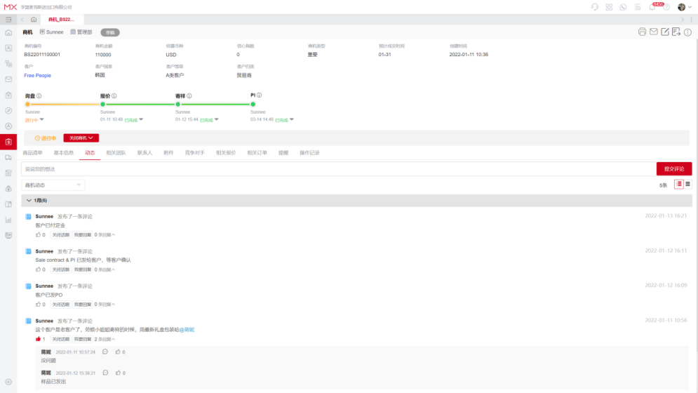 有些CRM也叫商机管理、或销售过程管理,销售机会通常是指发现了客户的意向之后,管理从初始阶段到最后成交的整个过程。在销售机会的管理页面中,你可以为客户设置销售阶段,完善客户的需求和预算,管理报价单,添加竞争对手信息,销售机会通常有以下状态:进行中、停滞、成功或灭失(丢单)。这个功能主要是帮助企业落地销售流程的管理,通过精细化的过程管理提升销售效率。外贸企业一般是从高意向询盘转为商机管理,对工厂报价,对外报价,样品开发,寄样确认,最后到成交各个环节进行精细化管理与成交分析。