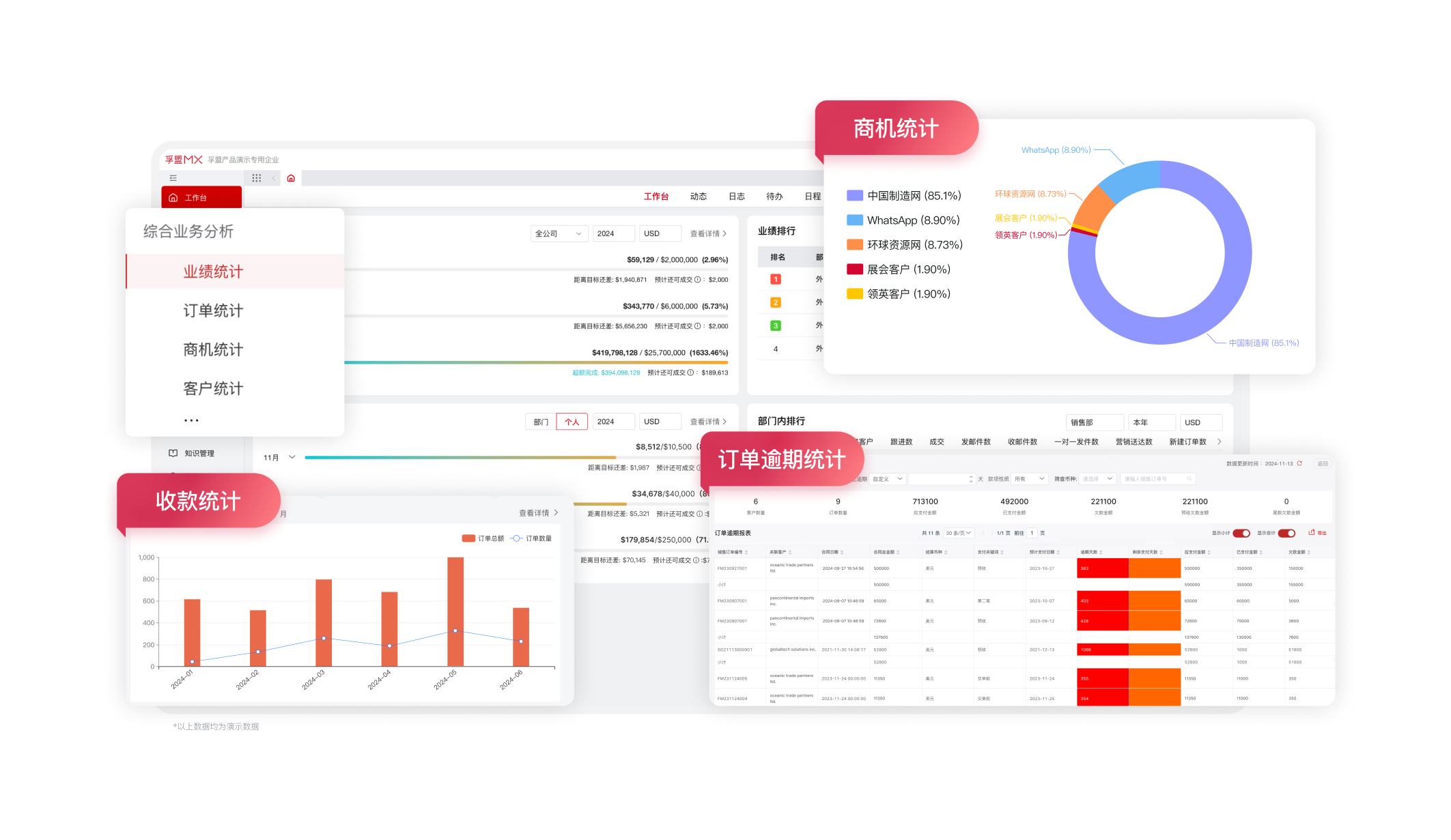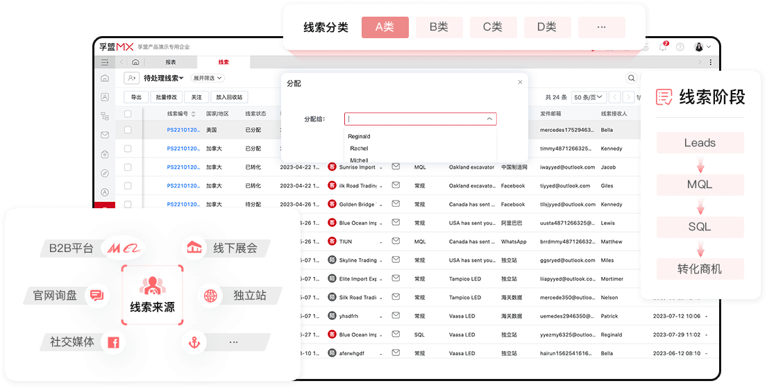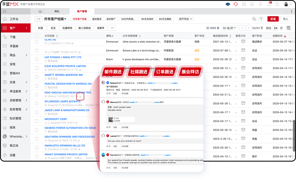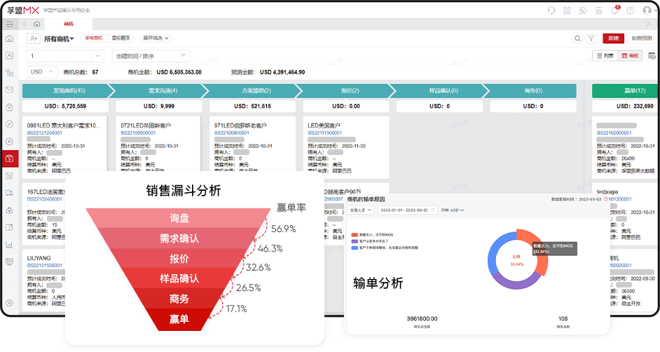 从线索到订单再到出货回款,外贸全流程闭环管理 整体方案 市场获客 线索分配 客户跟进 商机管理 订单管理 业务流程 统计报表 搭建数智化销售系统,推动外贸业绩持续增长 适用于纯贸易公司/工贸一体/跨境贸易公司 多渠道销售管理 精细化客户管理 可视化流程管理 智能化分析决策 立即体验 立即体验 聚合多渠道,获取更多销售线索 孚盟主动营销:汇集多种获客方式,满足外贸企业多元化获客需求,高效主动开发全球优质客户,突破拓客瓶颈 公域流量:多渠道汲取公域资源,以流量为抓手挖掘实力买家,链接高质量商机 立即体验 立即体验 精细的线索管理,提升线索质量与转化效率 根据外贸邮件特征,可自动辨识线索来源,自动完成线索分类与建档,实现多渠道线索集中管理。可对多渠道线索进行在线统一分配,跟进线索转化状态,并进行转化分析 立即体验 立即体验 提高外贸客户资源流转 加快客户成交 历史邮件、外贸询盘、外贸报价、外贸订单以及跟进记录,以时间轴方式呈现,快速追溯商务过程,规避报价风险,防止不及时跟进造成的客户流失 立即体验 立即体验 商机流程管理,助力销售最佳实践数字化落地 对意向线索创建商机,管理者通过可视化的方式,监控商机流程进度,提升部门协作效率,分清工作职责,保证线索转化。通过数据看板了解商机来源渠道,丢单、赢单的原因,进行有效复盘,以便企业优化转化流程,提升外贸询盘转化率 立即体验 立即体验 外贸跟单进度可视化,让每个订单都能准时交付 打造可视化跟单环境,做到外贸订单进度实时了解,节点各有数,进度不靠催,以规范订单行为为核心,最大程度提升询盘转化率 立即体验 立即体验 业务流程标准化运营,提升效率,降低成本 打造标准化外贸销售SOP,有效管控各类单证、报表、工单数据,闭环式业务流转体系为商机的稳定转化保驾护航 立即体验 立即体验 丰富完整的统计报表,提供全面、准确的数据分析和运营支持 自动汇总不同部门的数据,并按不同维度进行分类,并通过可视化图表、报表形式展示数据,让外贸企业管理者可以更加准确地评估企业运营状况,制定战略规划和业务决策 立即体验 立即体验