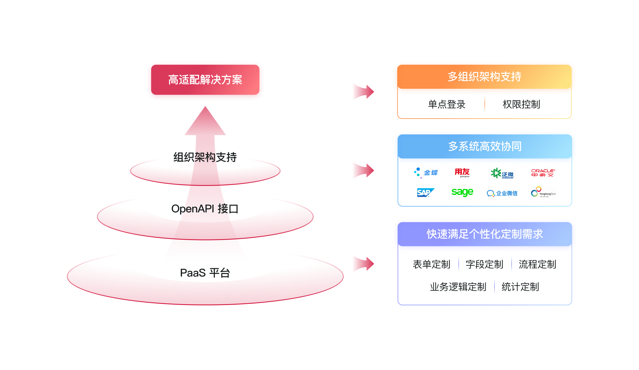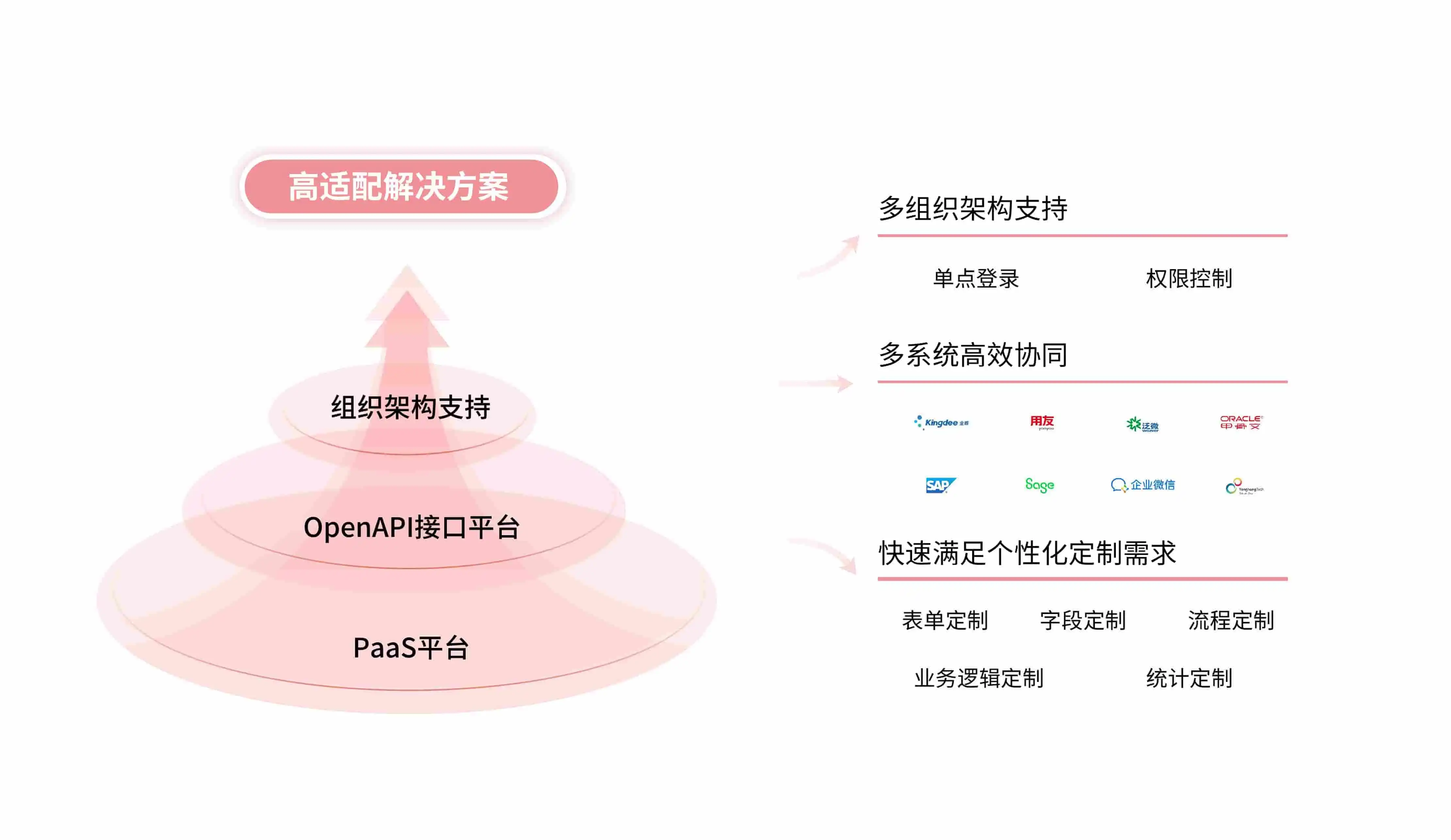 企业级PaaS能力包括细节化功能定制如:字段级权限控制、多条件流程管控、 自定义模块流程数据流转、自定义字段与条件计算公式、自定义页面区块展示、用户级页面习惯记忆、多组织抬头管理等内容